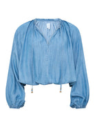 Langermet bluse med strikk rundt ermene og i midjen. Fra Ane Mone.