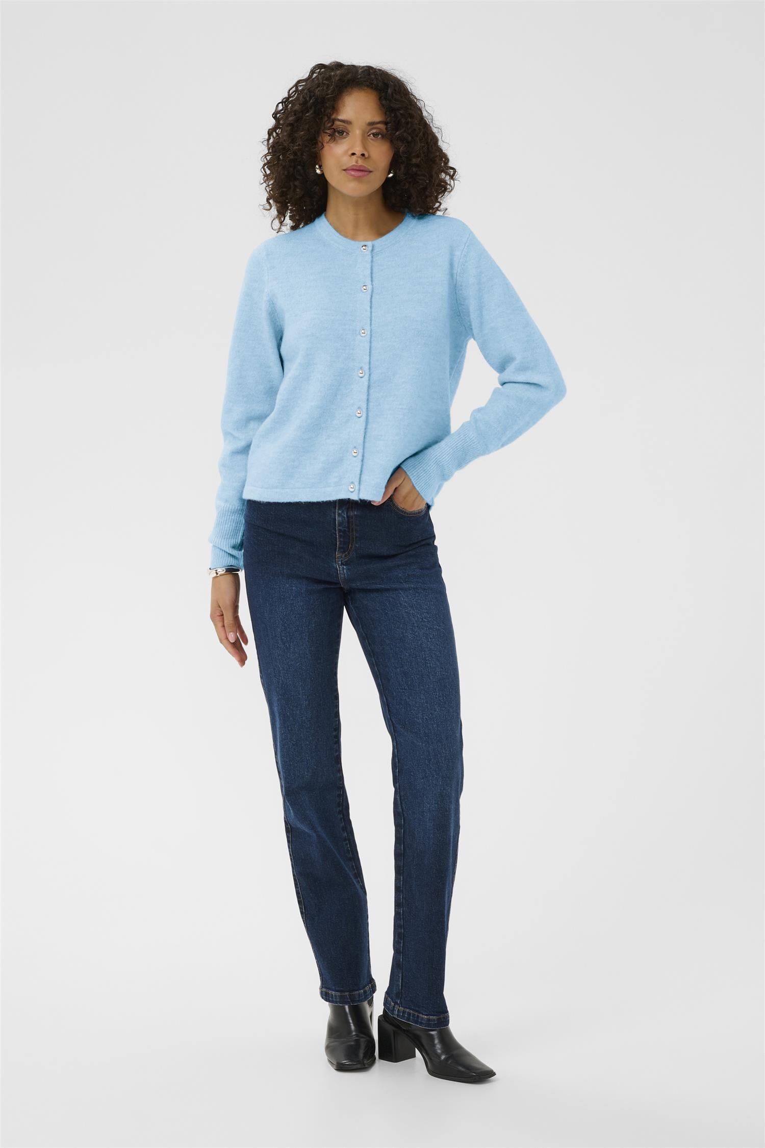 Cardigan med klassisk passform, rund hals og knapper foran. Lange ermer og ribbestrikkede mansjetter gir komfortabel stil. Egnet til hverdags og jobb.