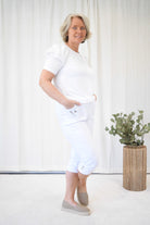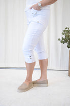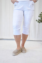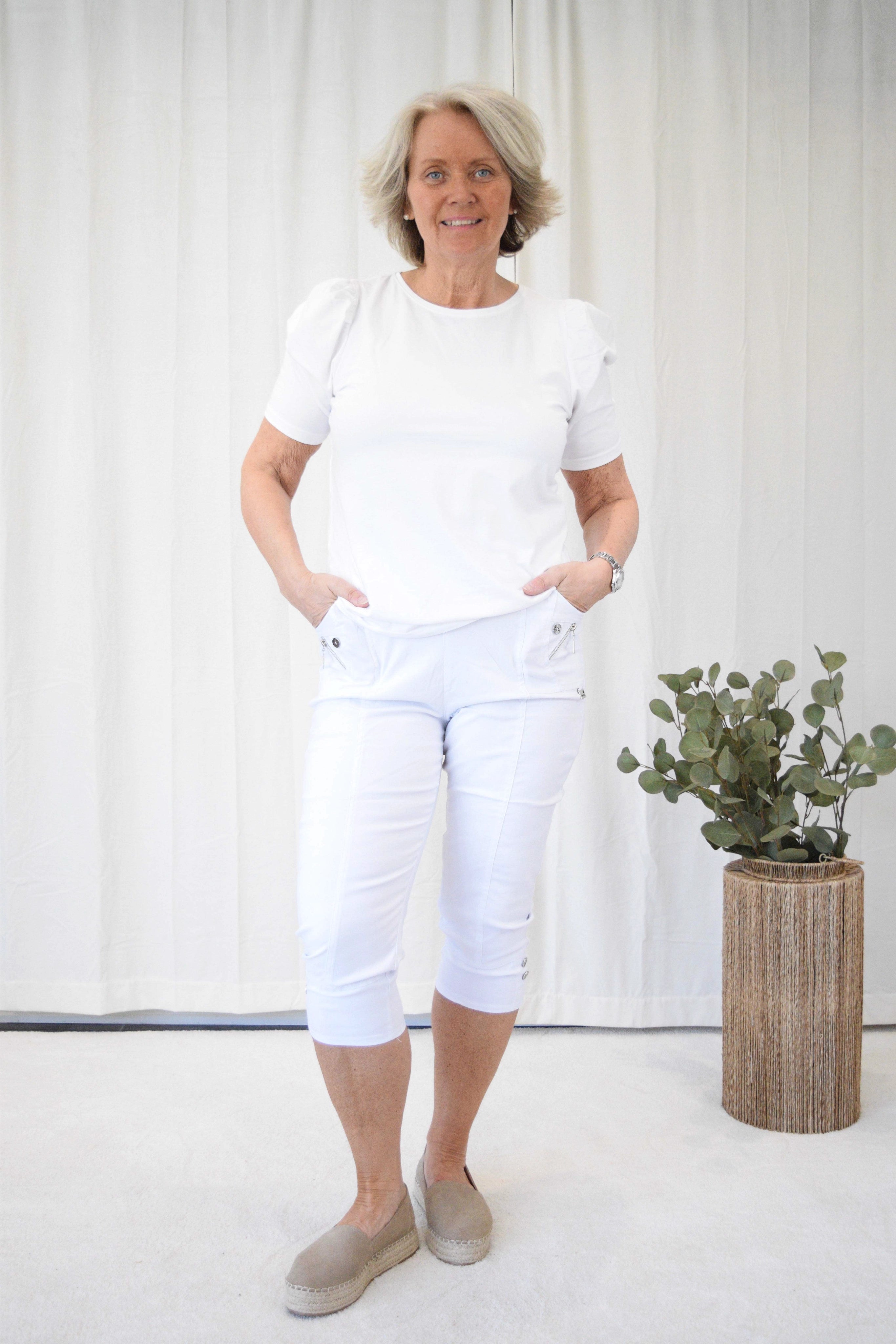 Caprilengden gjør den perfekt til vår og sommer – og super både til hverdags og litt finere anledninger. Buksa har dekorative detaljer som knapp og glidelåspynt på lommene foran, samt pynteknapper nederst på bena. Den har ingen baklommer for et rent og pent uttrykk.