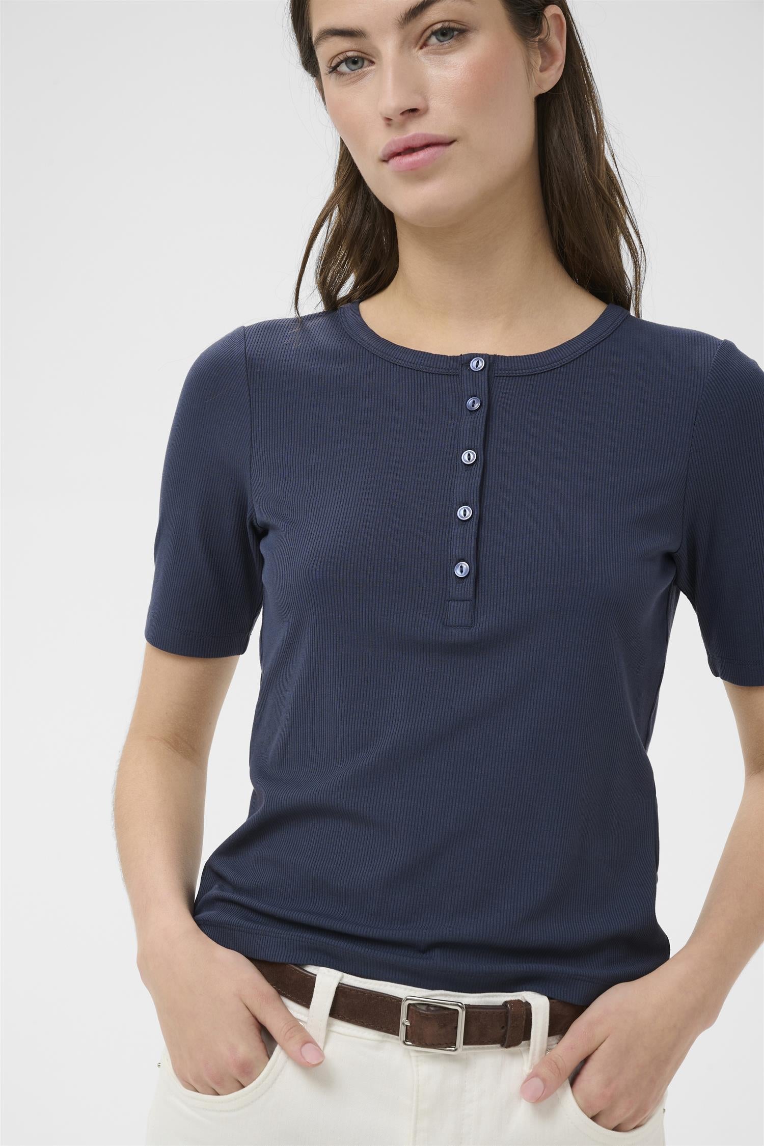 God t-skjorte med rund hals, god ermlengde og knappestolpe.