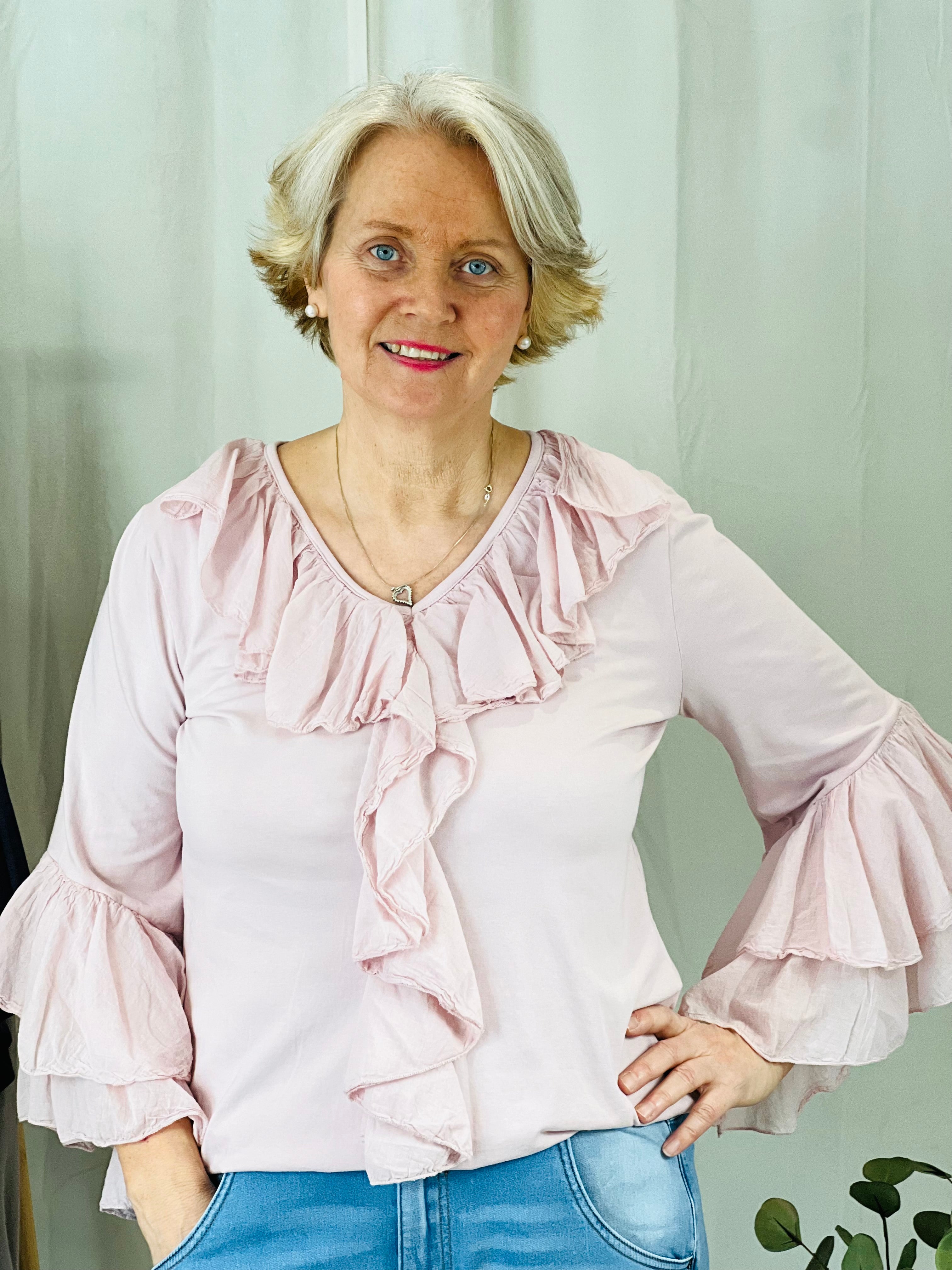 Lekker bomullsbluse med vollanger både på ermene og i front.