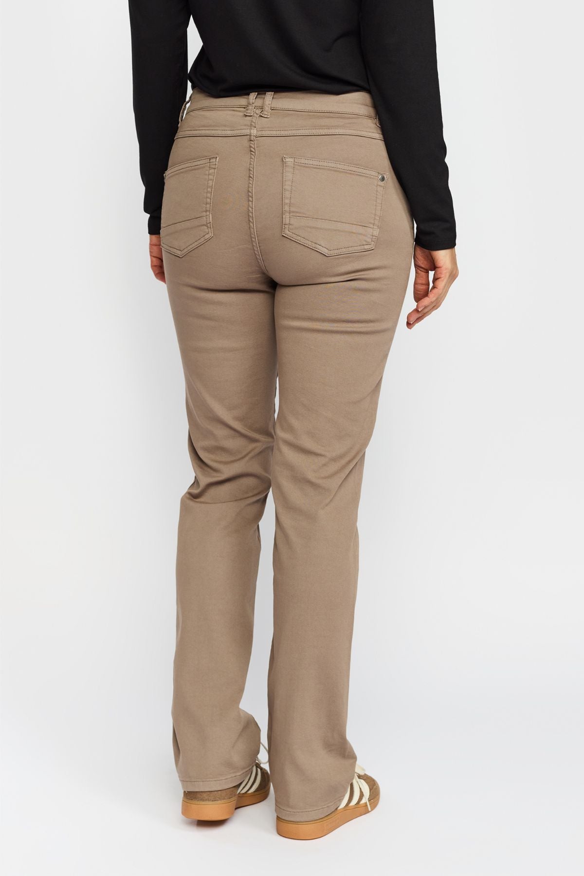 Den varme bruntonen Driftwood gjør buksen ekstra anvendelig – like fin til lyse topper og strikk som til klassiske basefarger.