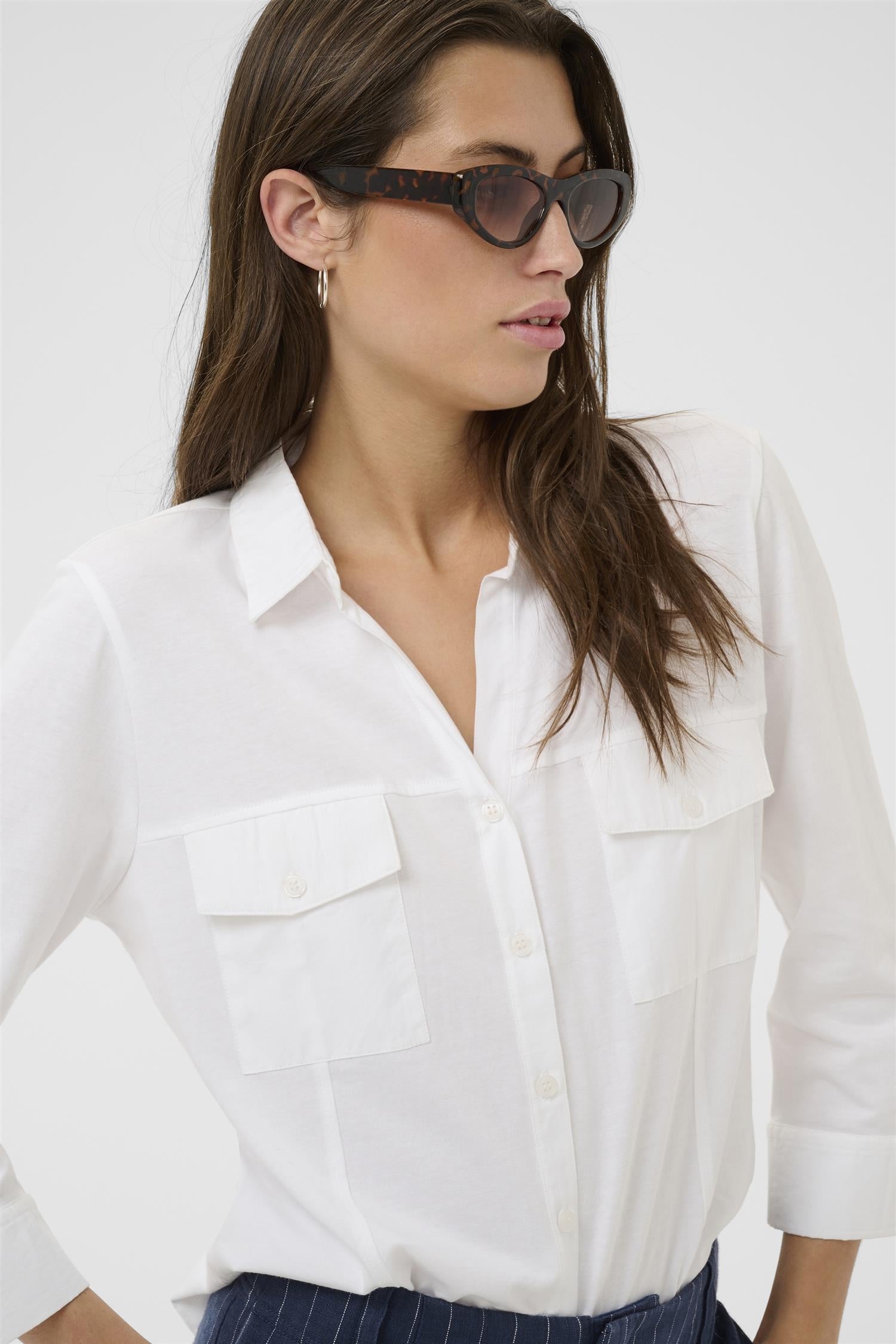 En stilren skjorte med lett innsvinget passform som gir et rent og moderne uttrykk. Den har klassisk krage og knappelukking i front for et tidløst preg, kombinert med 3/4-ermer som gir en avslappet og feminin silhuett. To brystlommer med klaff tilfører både karakter og funksjon, mens den glatte finishen gir et elegant og gjennomført utseende.